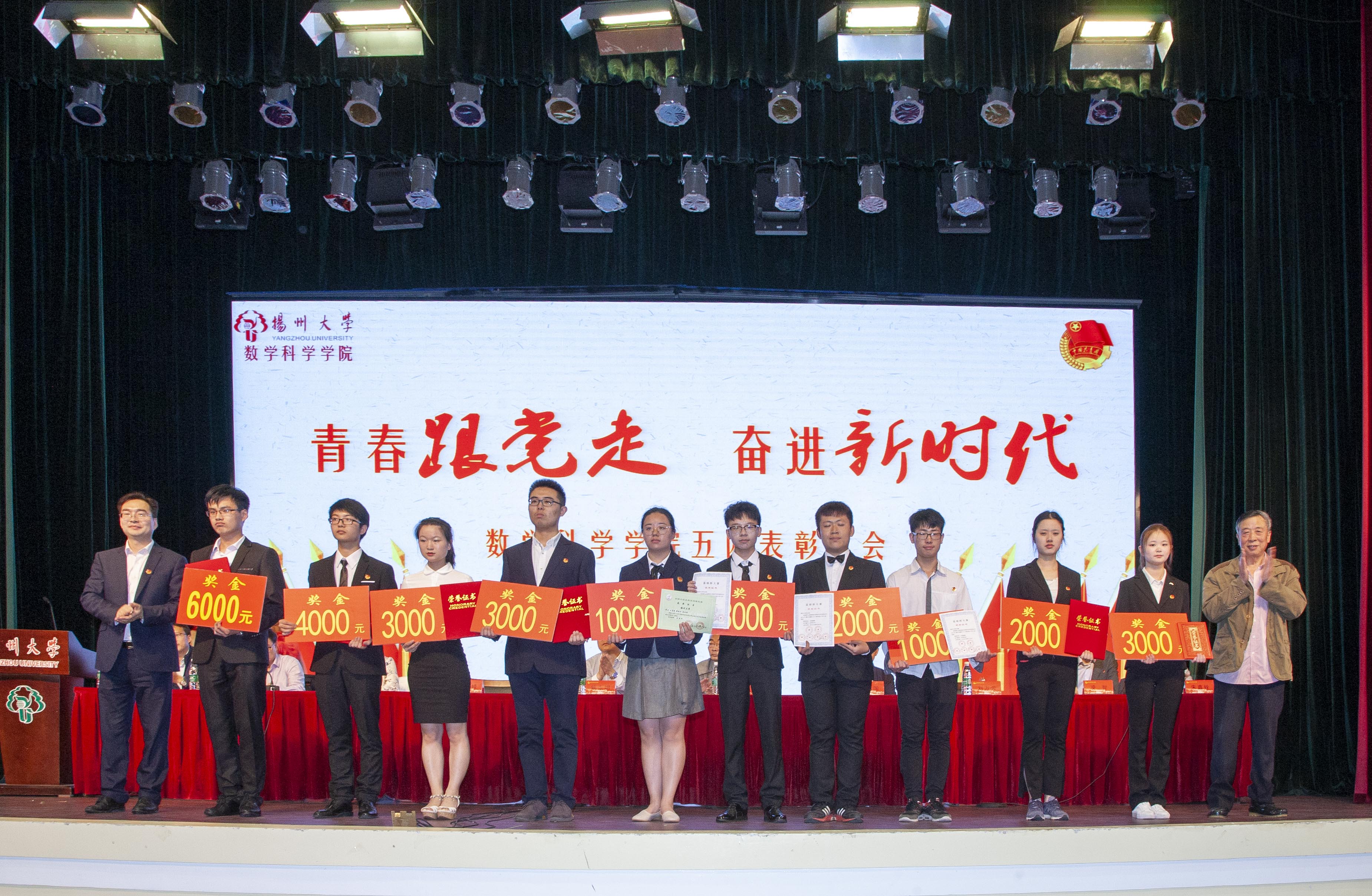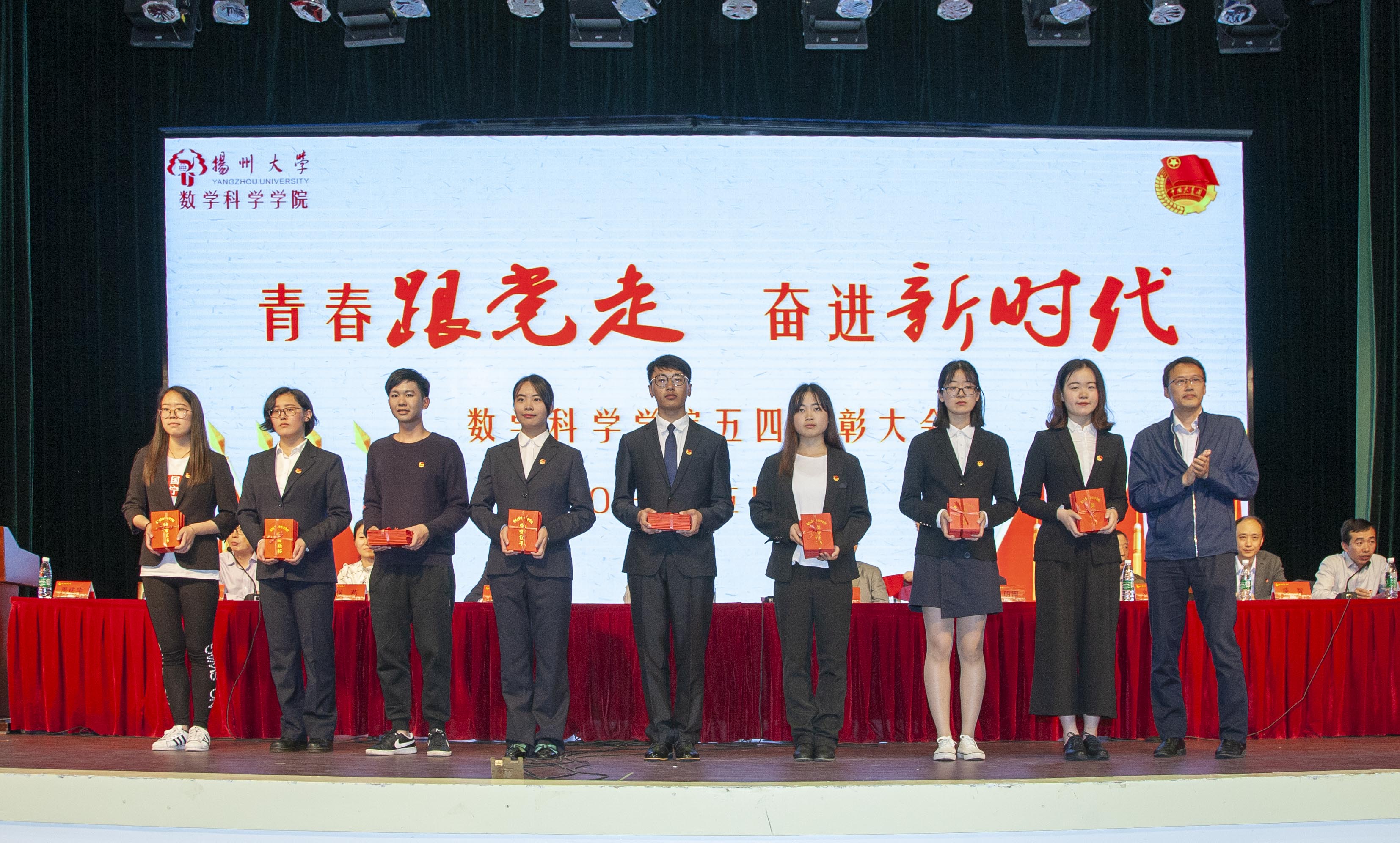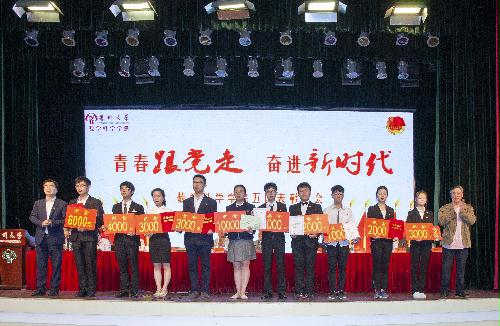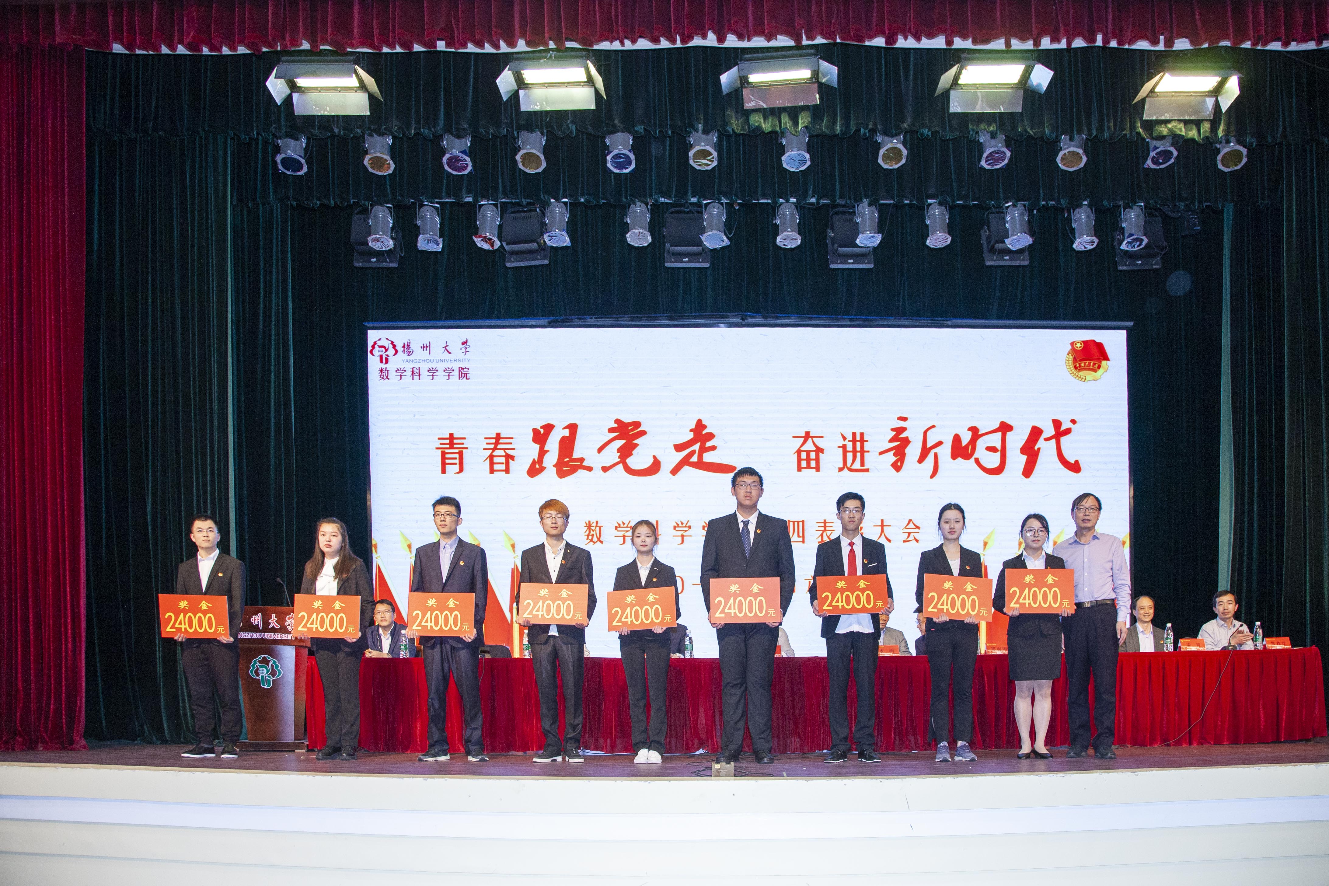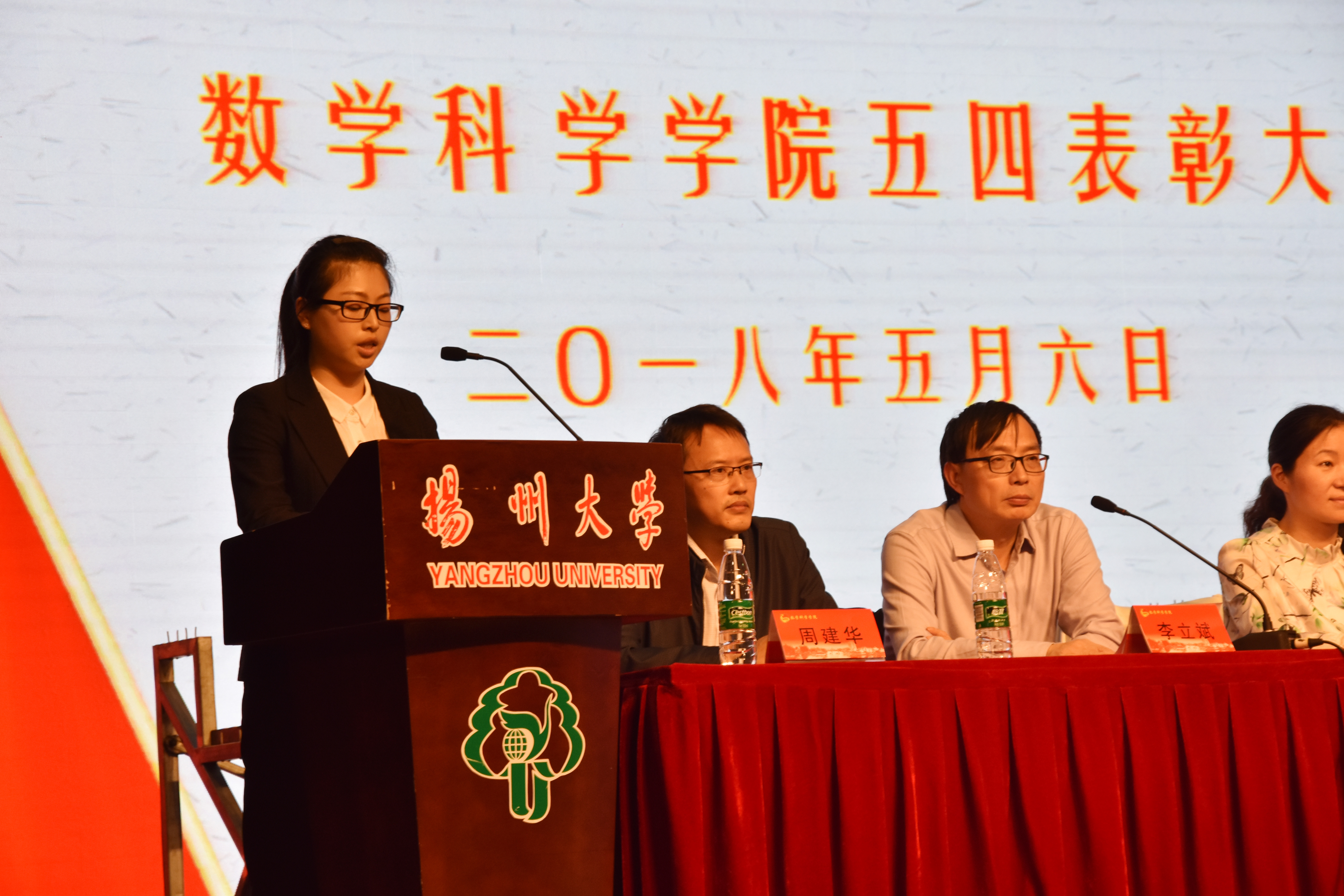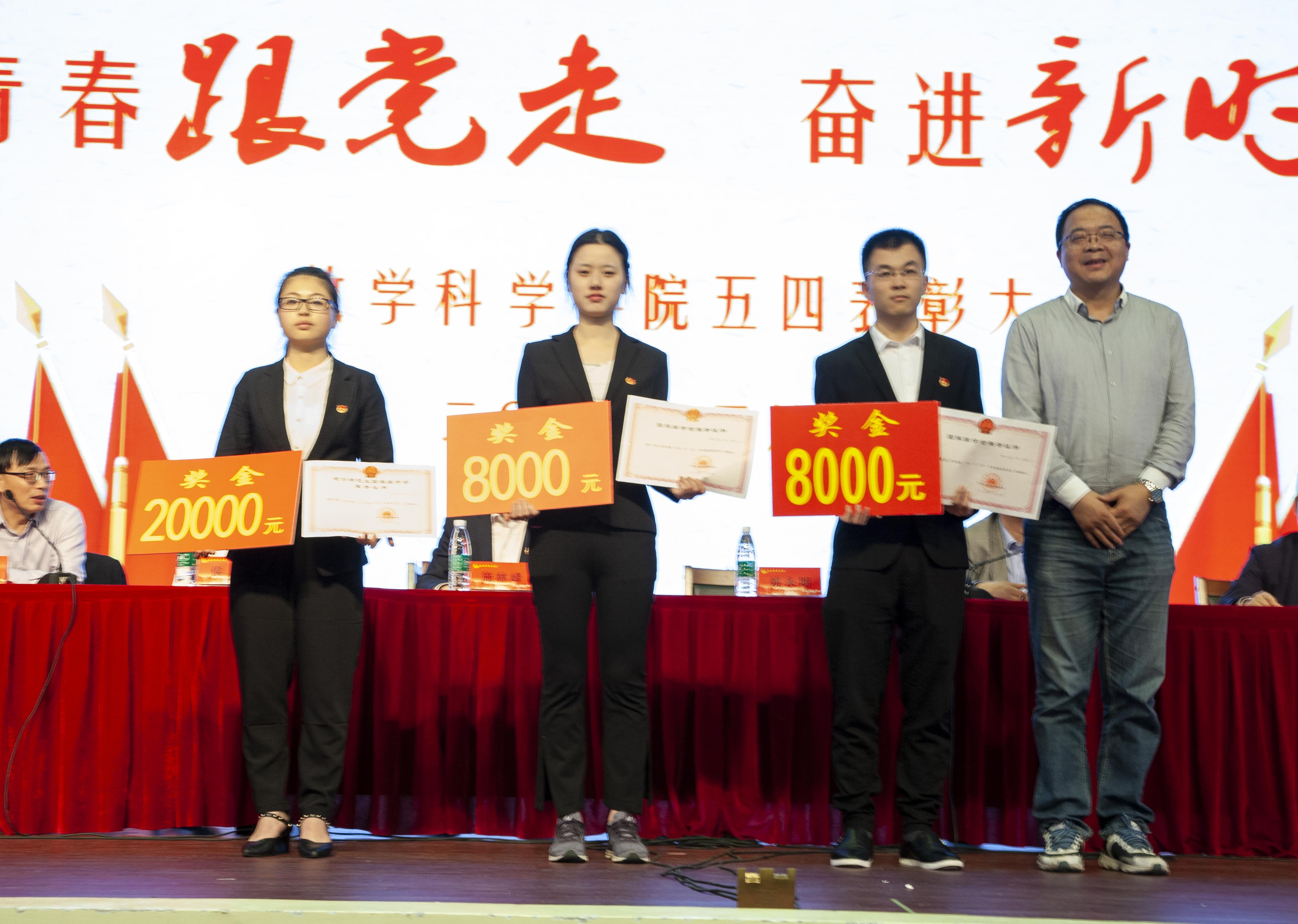 此次活动的第一项议程—五四表彰大会在庄严的国歌声中拉开帷幕。首先副院长李立斌老师宣读了2017年度省级以上获奖名单,接着副院长凌智老师宣读了2017-2018学年数学科学学院“五四”系列表彰决定。宣读结束后,出席活动的嘉宾为获奖同学、支部代表与团队代表颁奖。