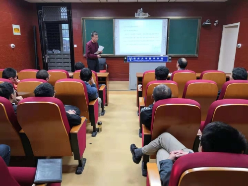 杜乃林教授自2004年以来开设武汉大学通识课程“数学精神与方法”,担任主讲至今。杜教授的报告从数学统一性和多样性哲学高度出发强调数学通识课的启发心智、开阔眼界作用,妙语横生且逻辑严谨,既高屋建瓴又理论实际。他打破传统数学教育沿少数几条经典线索纵向观赏的模式,从宽视野、多线索的横向视角选择教学材料、引导学生去品味数学的思想、方法、竞赛及其价值,激发数学感觉和兴趣。凌智副院长高度评价了杜教授的报告,认为杜教授数学通识课的开设经验和取得的成果对我院数学通识课的教学和研究具有很好的借鉴作用和指导意义。我院通识课开设老师和青年教师与杜老师就数学通识课程的视角选择、教材选用、考试内容和方式等方面进行了深入的研讨。