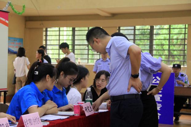 上午7时过后,已经有朝气蓬勃的2019级新生来到体育馆,新生们在成长伙伴的带领下,将录取通知书交给工作人员,并领取了校园卡、宿舍信息登记卡、教师信息卡片等物品。