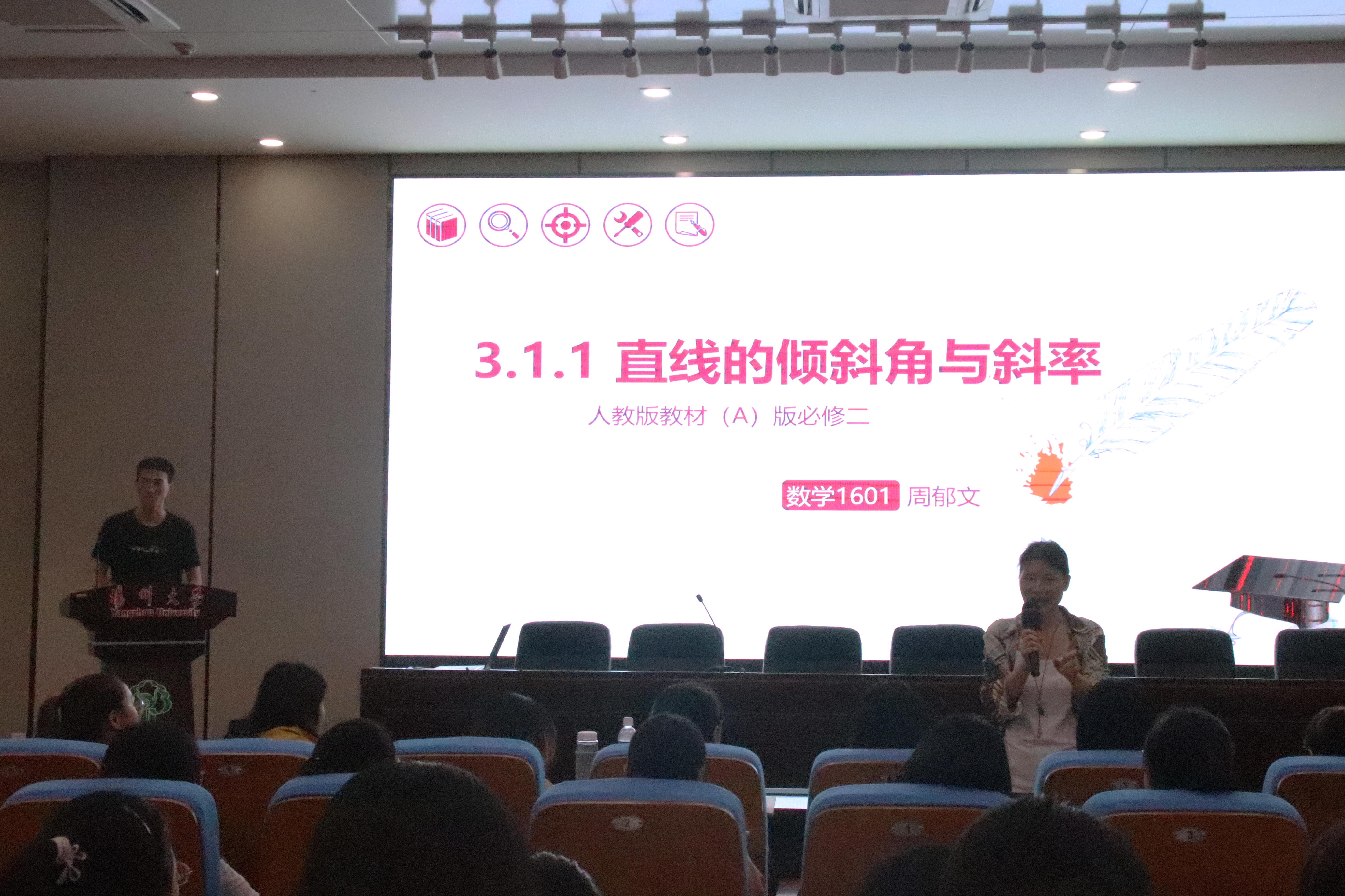 首先,董琳琳同学主讲《两角差的余弦公式》,详细地解释定理,并用例子加深同学们对该知识的印象。随后,周郁文同学讲解《直线的倾斜角和斜率》,用简单易懂的语言讲解内容,图文并茂,让同学们对直线的倾斜角与斜率有了更加深刻的认识。在讲课示范期间,两位同学以端正严明的态度,自信流畅的语言展示了一位师范生的风采,为其他同学树立了正确的榜样。紧接着,陈算荣老师邀请16级、17级的同学对董琳琳、周郁文两位同学的示范进行点评,指出其中的不足与缺陷,提出自己的意见与建议。同时,陈老师根据两位同学的课程设计与现场发挥的优缺点,做出了自己的指导意见,为两位同学出现的错误提供了正确的学术指导,并赞扬两位同学的出色表现,希望他们再接再厉,更希望所有同学安排好自己的见习计划,为接下来的课程做好准备。