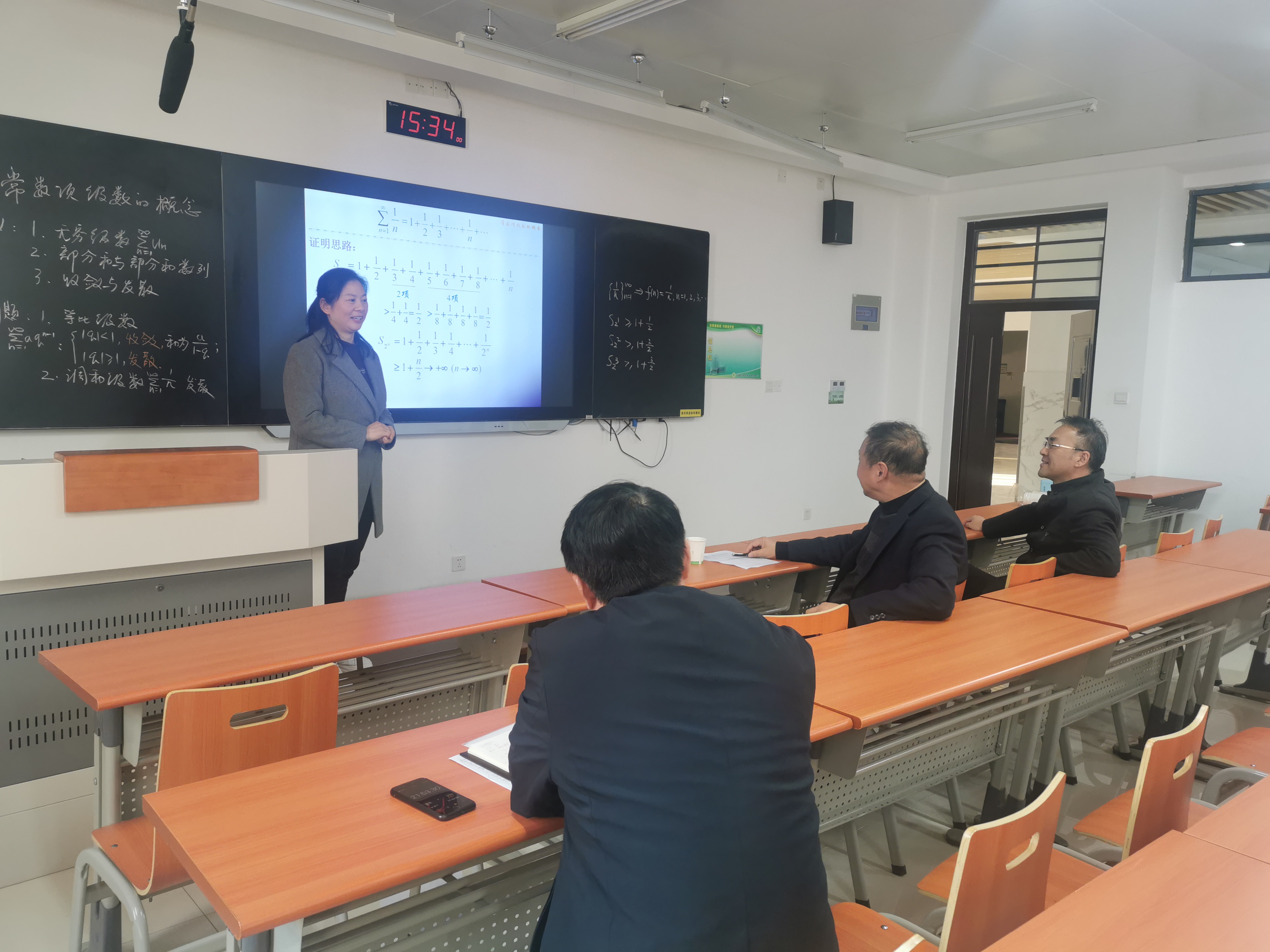 沙龙第一阶段,朱兰萍老师作示范汇报课《无穷级数的概念》,该课在江苏省高校第七届数学基础课青年教师授课竞赛暨首届全国大学数学课程思政邀请赛中获得一等奖。朱老师以芝诺悖论引入无穷级数概念,通过部分和(有限和)定义级数和(无限和),正如恩格斯在《反杜林论》中指出的“因为在数学上,为了达到不确定的、无限的东西,必须从确定的、有限的东西出发”;通过《庄子 天下篇》:“一尺之棰,日取其半,万世不竭”将思政元素自然融入课程教学。沙龙第二阶段,专家们就数学专业课课程教学中思政元素的挖掘、融入策略和教学实施等问题进行深入研讨。王栓宏教授重点解读了教育部下发的《高等学校课程思政建设指导纲要》,强调了专业课程中特别是理学、工学等如何融入“课程思政”元素,明确课程思政建设的目标和内容重点;姚泽清教授讲解了数学课程思政建设的内涵与途径,在实现“丰富、有趣”的基础上,如何兼顾数学学科特点,做好融入思政元素的教学设计;骈俊生教授则分享了教学中如何突出重点内容,让教学过程更为自然流畅的经验。