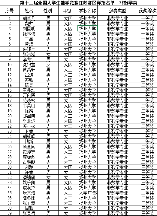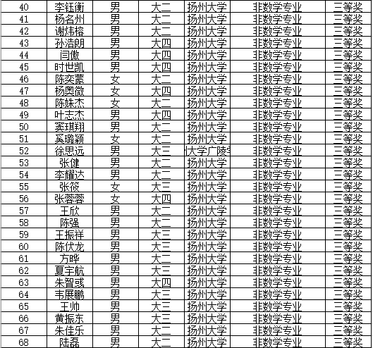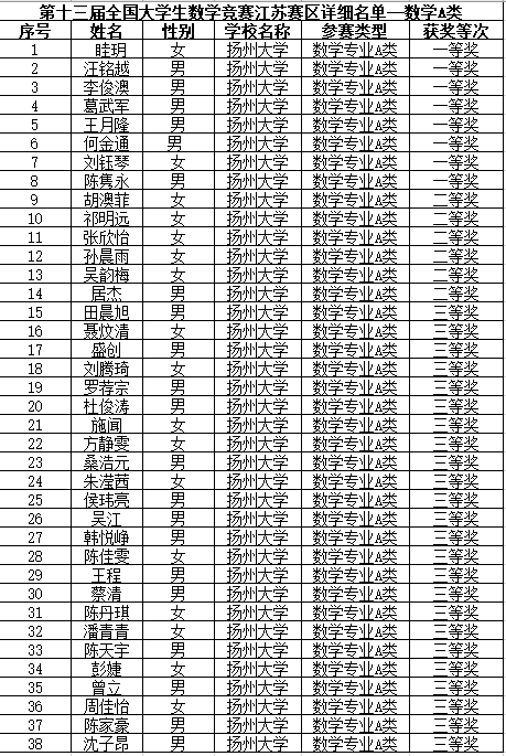 日前,2021年第十三届全国大学生数学竞赛初赛成绩公示。我院学子再次获得佳绩,一共获得数学专业A类一等奖8人、二等奖6人、三等奖24人,非数学专业一等奖9人、二等奖20人、三等奖39人。其中眭玥、汪铭越和李俊澳三位同学进入数学专业A类全国决赛。江苏省仅24人进入数学专业A类全国决赛。