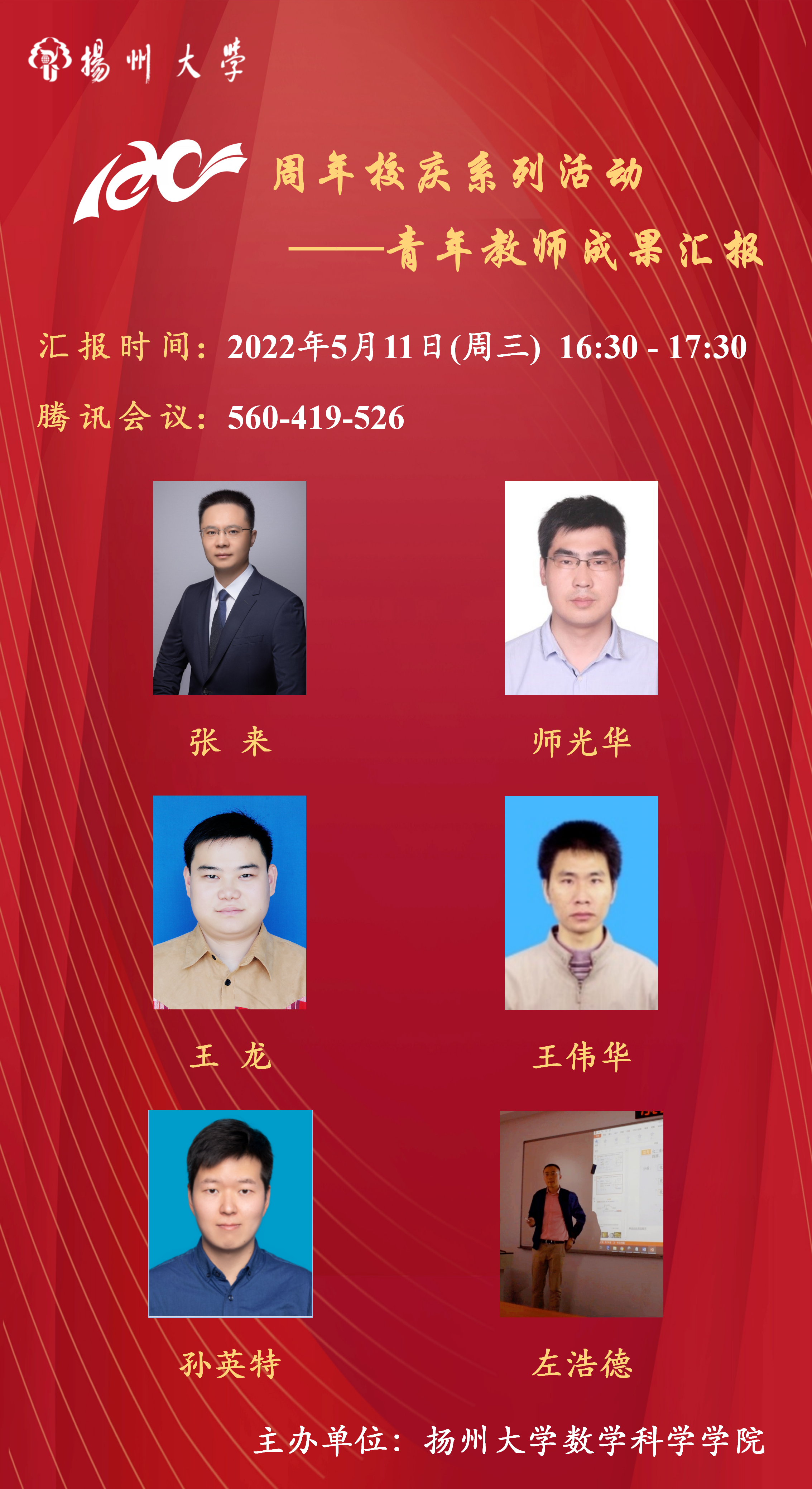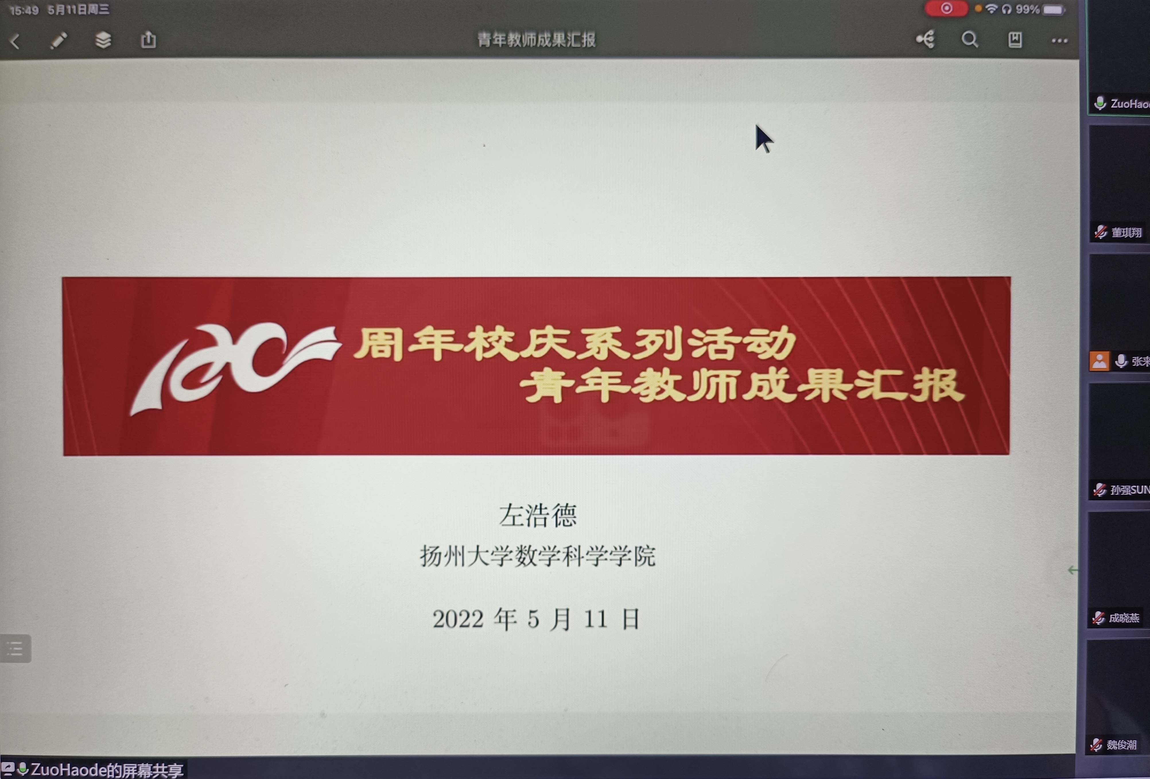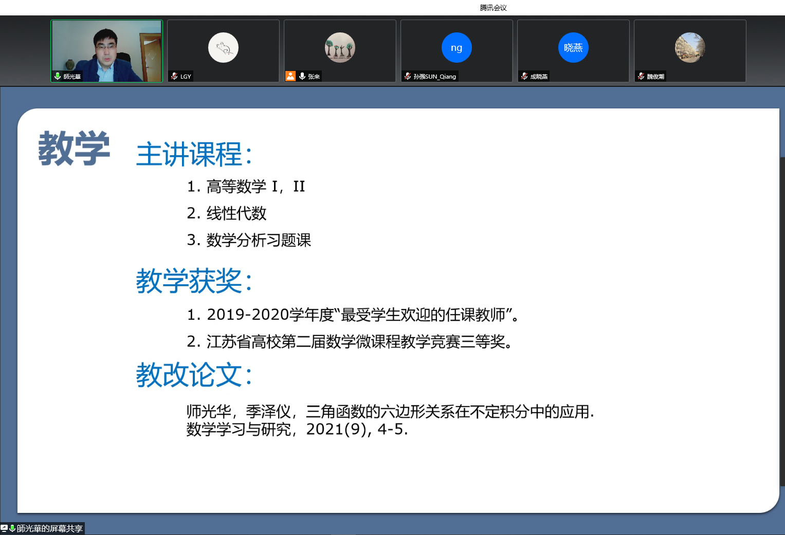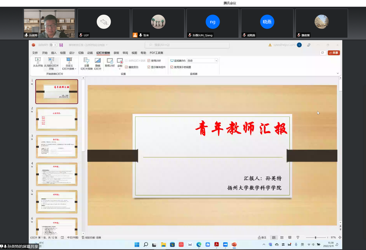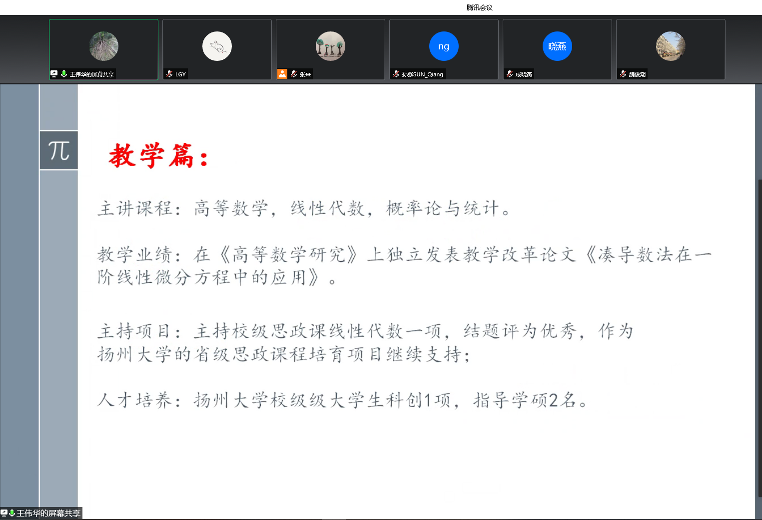 为进一步做好我院青年教师的发展培养规划,展示青年教师科学研究成果,打造优秀人才成长环境,5月11日下午,我院线上举行了青年教师成果汇报会。学院领导班子、学术委员会成员、全体教职工参加了会议,会议由张来副院长主持。