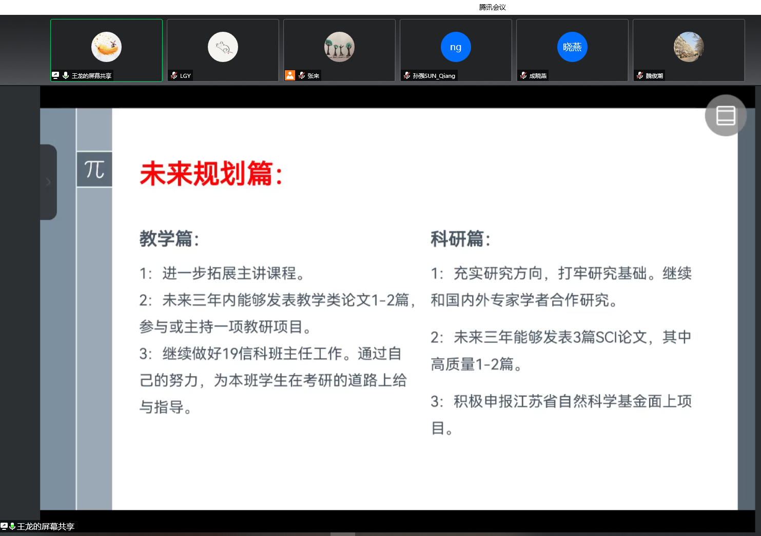 会上,六位青年教师作了成果汇报展示。他们是2017年入职的张来老师、师光华老师,2018年入职的王龙老师、王伟华老师、孙英特老师和左浩德老师。老师们从教学、科研、社会服务和未来规划等方面进行了汇报,展示了工作成果和特色亮点,提出了感兴趣的科研方向及拟开展的合作情况,也探讨了工作中遇到的难点瓶颈。