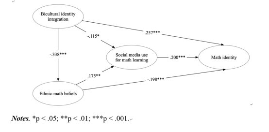该项研究结果主要表明了社交媒体使用在少数族裔学生数学学习中的有益作用。虽然社交媒体在教育方面的潜力已经得到了广泛的认可,但社交媒体使用是否能为少数族裔学生的数学认同和数学身份的发展提供机会,这一问题仍然不清楚。本研究基于数学认同的社会化框架,考察了社交媒体用于数学学习、双重文化认同整合、族裔-数学信念和数学认同之间的关系,以中国少数民族高中生为研究对象。结构方程模型的结果显示:(a)社交媒体使用与数学认同呈正相关;(b)高度的双重文化认同整合与数学认同呈正相关,而偏颇的族裔-数学信念与数学认同呈负相关;(c)社交媒体使用抑制了数学认同的社会化过程,削弱了低度的双重文化认同整合和偏颇的族裔-数学信念在塑造数学认同中的不利作用。