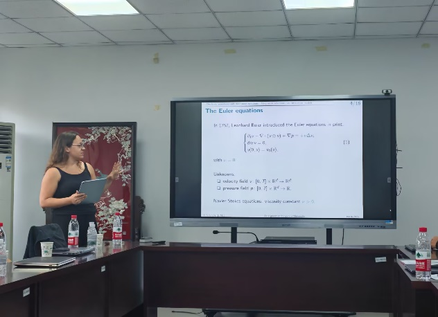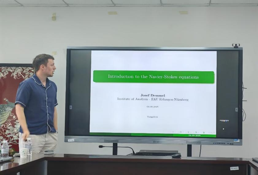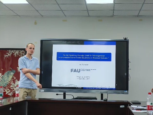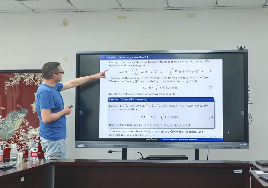 学术研讨会上,四位德国学者分别就偏微分方程领域前沿方向作专题报告:Schindler Jule博士梳理了欧拉方程及其弱解问题的研究进展;Stefan Škondrć 博士则围绕Navier-Stokes方程的弱-强唯一性相对能量方法展开阐述;Schröder Jens博士报告了有界域上非齐次不可压Navier-Stokes方程的vanishing viscosity极限问题;Demmel Josef博士则为在场师生系统介绍了Navier-Stokes方程的基本理论与Leray-Hopf框架。