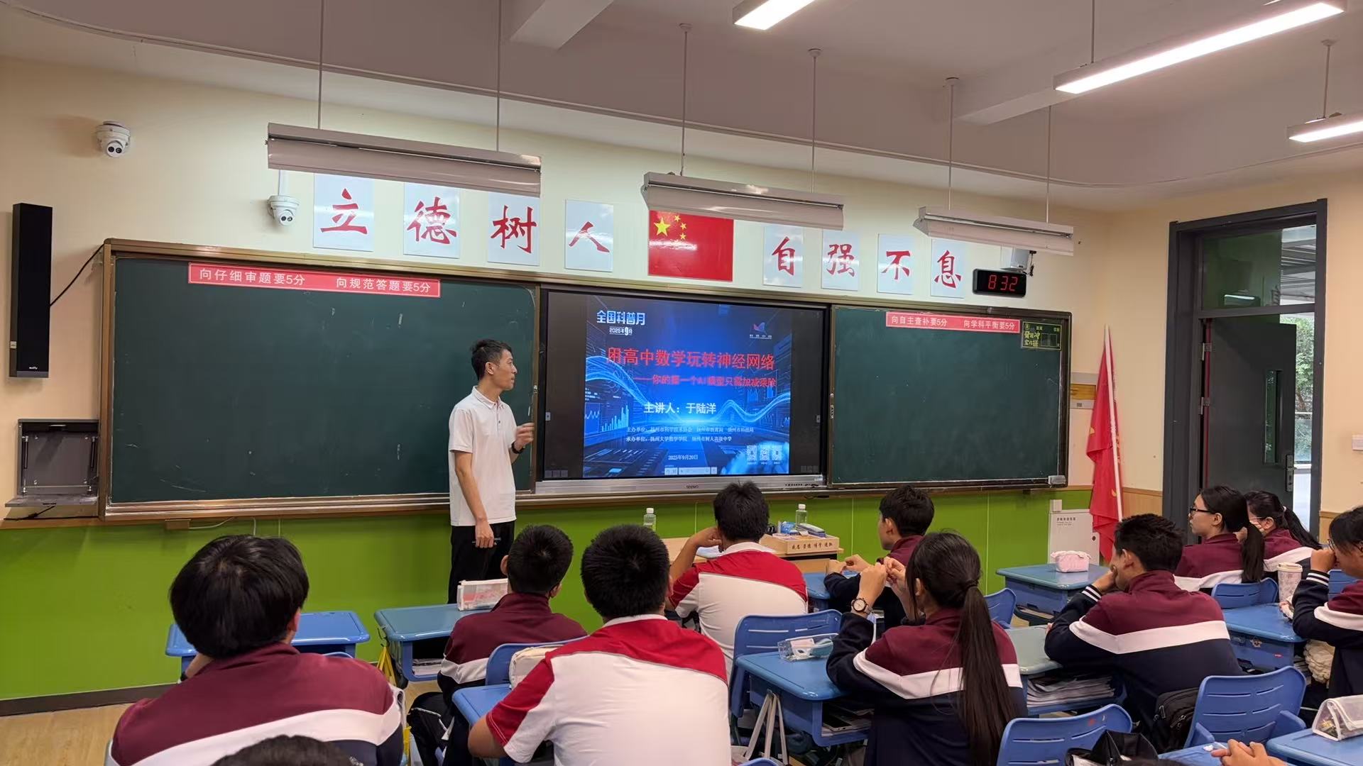 2025年9月20日,正值全国科普月期间,由扬州市科学技术协会、扬州市教育局、扬州市科技局联合主办,扬州大学数学学院与扬州市树人高级中学共同承办的科普讲座顺利开展。“新视野”数学科普团队成员、我院青年教师于陆洋以“用高中数学玩转神经网络”为题,为高中生讲授“只用加减乘除就能搭建的AI模型”。