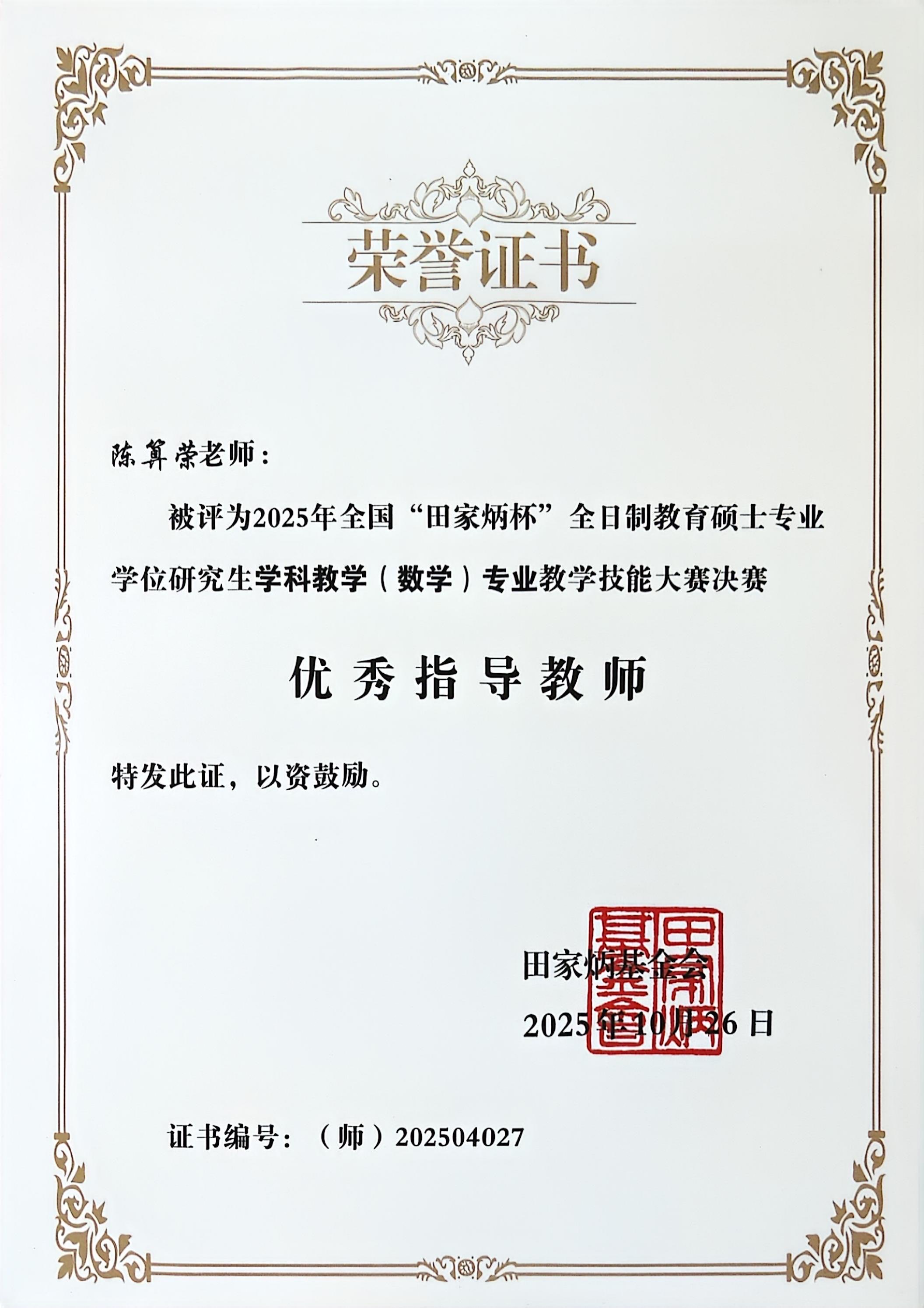 这份殊荣的获得,得益于陈算荣老师在学科教学(数学)研究生培养中的长期深耕与锐意创新。她始终锚定 “教研融合、知行合一” 的培养理念,深耕课程体系革新与实践能力锻造,既以扎实的学科功底筑牢研究生的数学理论根基,又通过搭建教学实践平台、推行项目式培养等创新举措,引导学生打通 “理论学习” 与 “教学应用” 的壁垒。多年来,她深耕不辍、守正创新,用系统的培养方案、精准的个性化指导和前沿的教研视野,为学科输送了一批批兼具理论深度与实践能力的高素质数学教学人才,这份认可正是对她多年坚守与创新的最佳回馈。