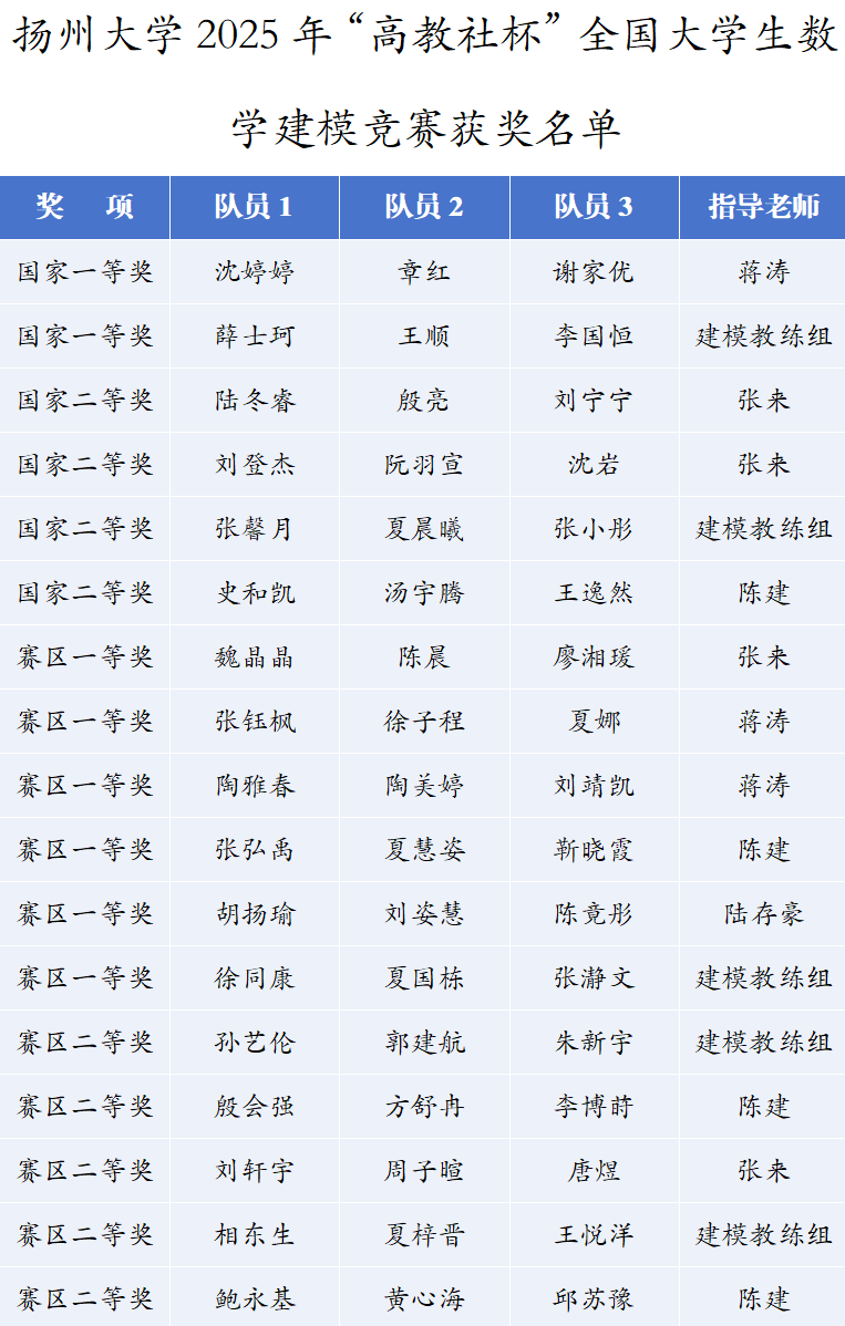 近日,2025年“高教社杯”全国大学生数学建模竞赛获奖名单正式公布。扬州大学学子取得历史最好成绩,荣获国家一等奖2项、二等奖4项;江苏省赛区一等奖6项、二等奖13项、三等奖9项。祝贺获奖的同学和老师们!