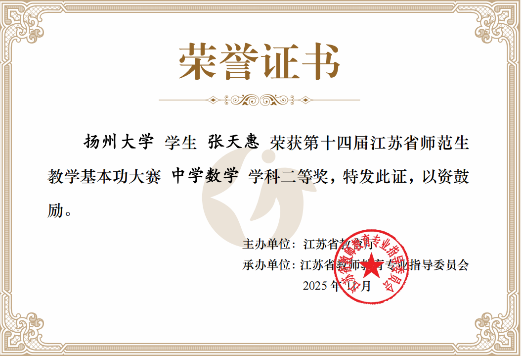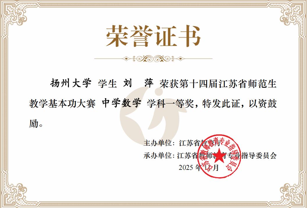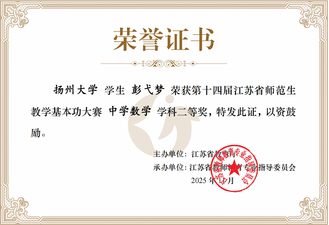 近日,第十四届江苏省师范生教学基本功大赛结果正式揭晓。我院2022级数学与应用数学(师范)专业三位同学经过多轮激烈角逐脱颖而出,喜获佳绩:刘萍荣获一等奖,张天惠和彭弋梦荣获二等奖。