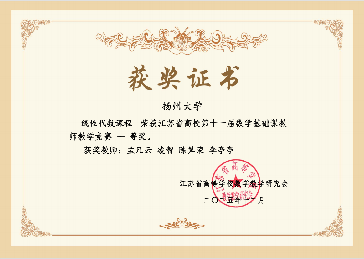 12月4日至5日,第十一届江苏省高校数学基础课教师授课竞赛教学创新赛道在淮安成功举办。来自全省高校的29支参赛团队齐聚一堂,共研教学创新。我院教师表现出色,斩获优异成绩:孟凡云老师荣获一等奖,李强老师荣获二等奖。