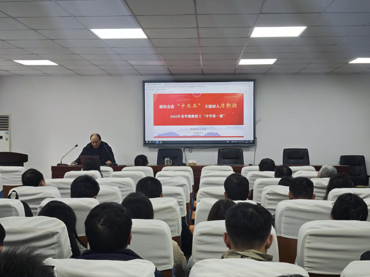 3月11日下午,我院召开2026年春学期教职工“开学第一课”专题学习会。学院党委书记凌智主讲,学院领导班子及全体教职工参加会议。