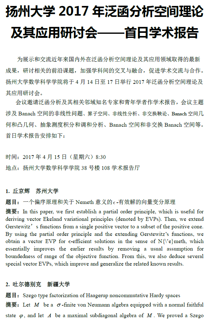 扬州大学2017年泛函分析空间理论及其应用研讨会——首日学术报告