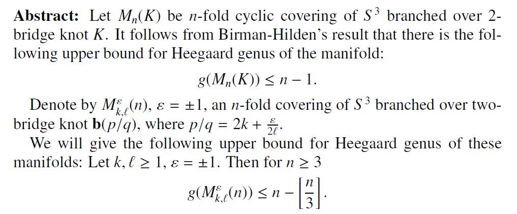 报告题目:On Heegaard genus of cyclic coverings of 2-bridge knots