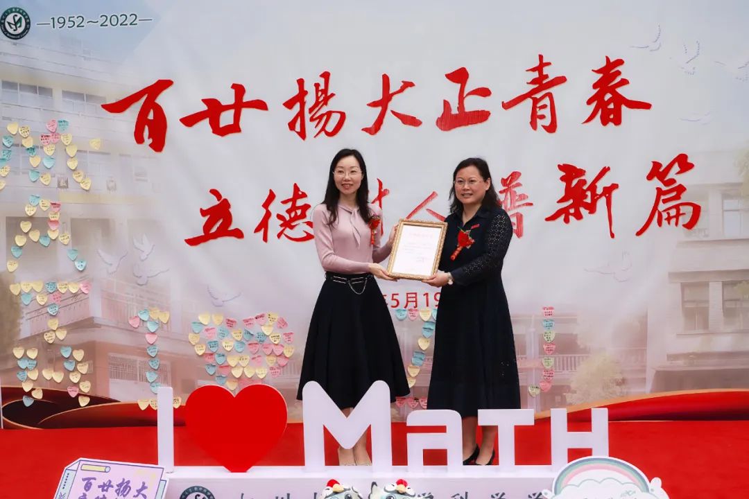 院党委书记郭丽向97级校友代表、扬大附中陈磊老师颁发捐赠证书。