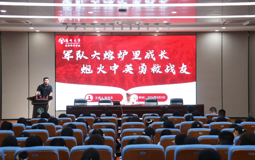 在讲座中,刘方云老师向我们讲述了他从童年到入伍的成长生涯和从军期间的英勇事迹,尤其强调了勤俭节约的重要性以及青年人应当不怕苦、不怕穷,面对困境不气馁,努力拼搏出自己的未来。刘老师详细叙述了他服役过程中的经历——特别是他当年在战场上冒着生命危险救下受伤战友的故事,令人钦佩。从刘方云老师的讲述中,新生们受益颇多,这无疑是最好的“开学第一课”。